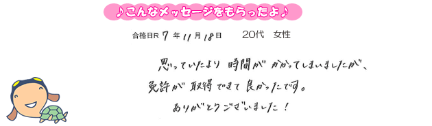 思っていたより時間がかかってしまいましたが、免許が取得できて良かったです。ありがとうございました!