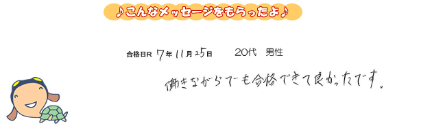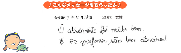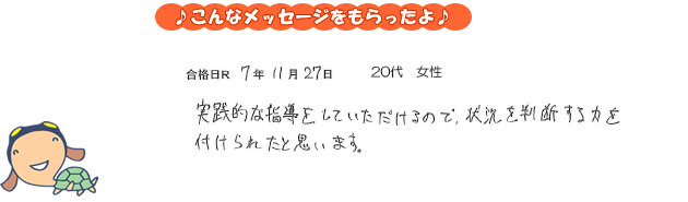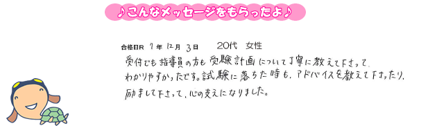 本当にお世話になり、ありがとうございました。「頑張って下さい。諦めなければ絶対合格できます!」とお声掛け頂き、合格することができました。
