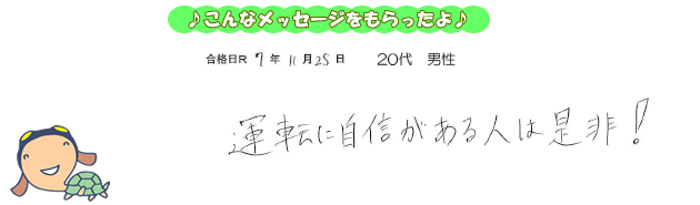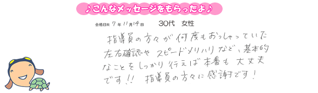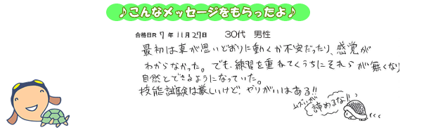 的確にご指導いただいたおかげで、本番は緊張せず、運転することが出来ました。