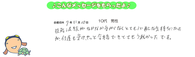 技能試験がなかなか受からなくとても心配な気持ちになったが、何度も受け、やっと合格できとてもうれしかったです。