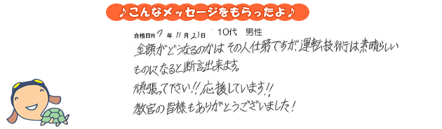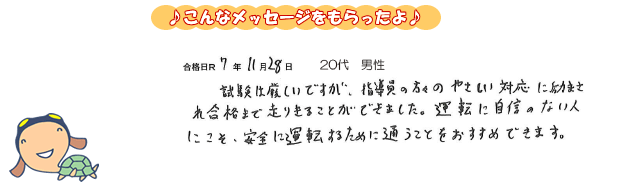 教官に教えていただいたことが路上試験で大変役立ちました。