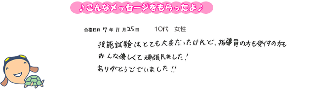 技能試験はとても大変だったけれど、指導員の方も受付の方もみんな優しくて頑張れました!ありがとうございました!!