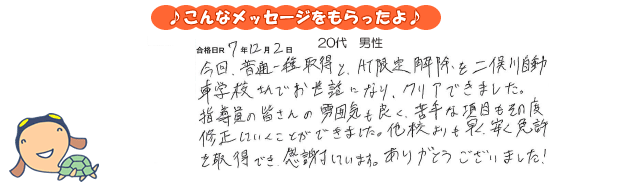 無事に合格することができました。二種という事で、今まで自身の運転の見直しにもなり、安全確認からの御指導、ありがとうございました。