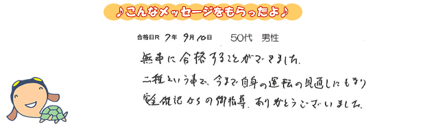 無事に合格することができました。二種という事で、今まで自身の運転の見直しにもなり、安全確認からの御指導、ありがとうございました。