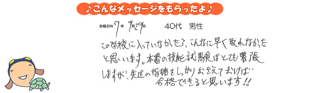 この学校に入っていなかったら、こんなに早く取れなかったと思います。本番の技能試験はとても緊張しますが、先生の指摘をしっかりおさえておけば合格できると思います!!