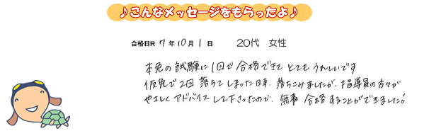 本免の試験に1回で合格できてとてもうれしいです。 仮免に2回落ちてしまった時、落ちこみましたが、指導員の方々がやさしくアドバイスして下さったので、無事合格することができました!