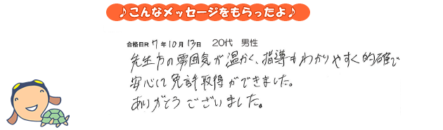 先生方の雰囲気が温かく、指導もわかりやすく的確で、安心して免許取得ができました。ありがとうございました。