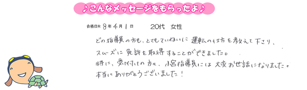 丁寧に指導していただきありがとうございました!毎回教習を楽しくできました!ありがとうございます!