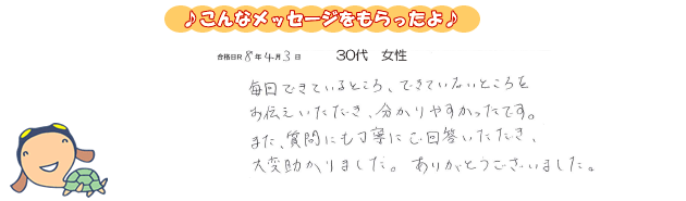 毎回できているところ、できていないところをお伝えいただき、分かりやすかったです。