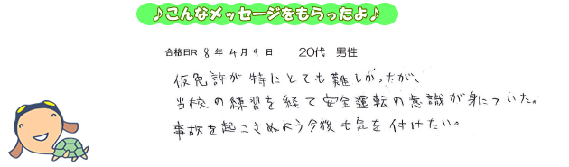 仮免許が特にとても難しかったが、当校の練習を経て安全運転の意識が身についた。事故を起こさぬよう今後も気を付けたい。