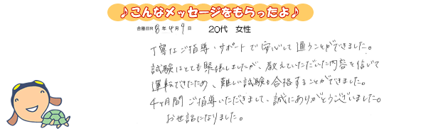 試験はとても緊張しましたが、教えていただいた内容を信じて運転できたため、難しい試験も合格することができました。